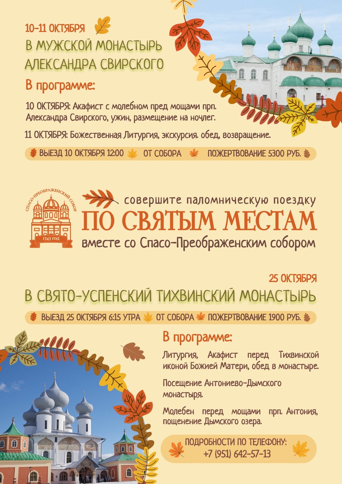 По благословению настоятеля Спасо-Преображенского собора протоиерея Николая Брындина в октябре состоятся паломнические поездки к великим святыням Русской земли. Приглашаем вас разделить радость совместной молитвы и духовного путешествия.
